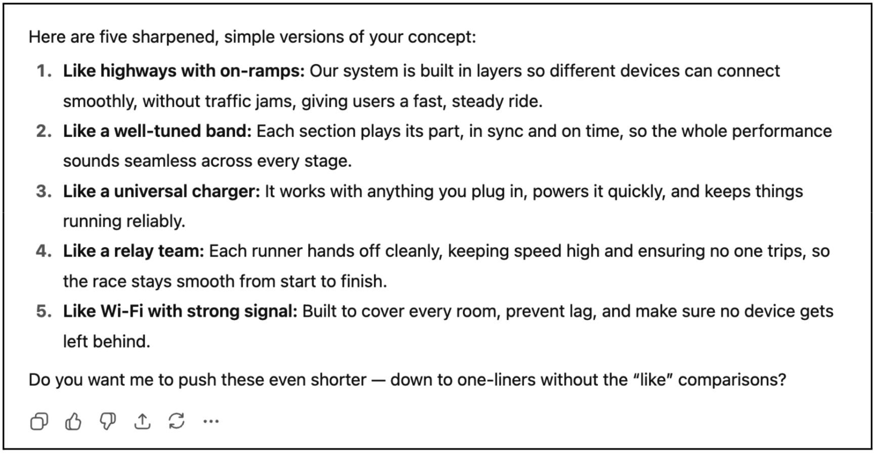 I’m going to write out a complicated concept. I want you to sharpen and clarify what I’m saying by mapping the abstract to something simple and familiar, and making it far more concise than the original version. It should be as short as possible. Give me five different options. Are you ready?