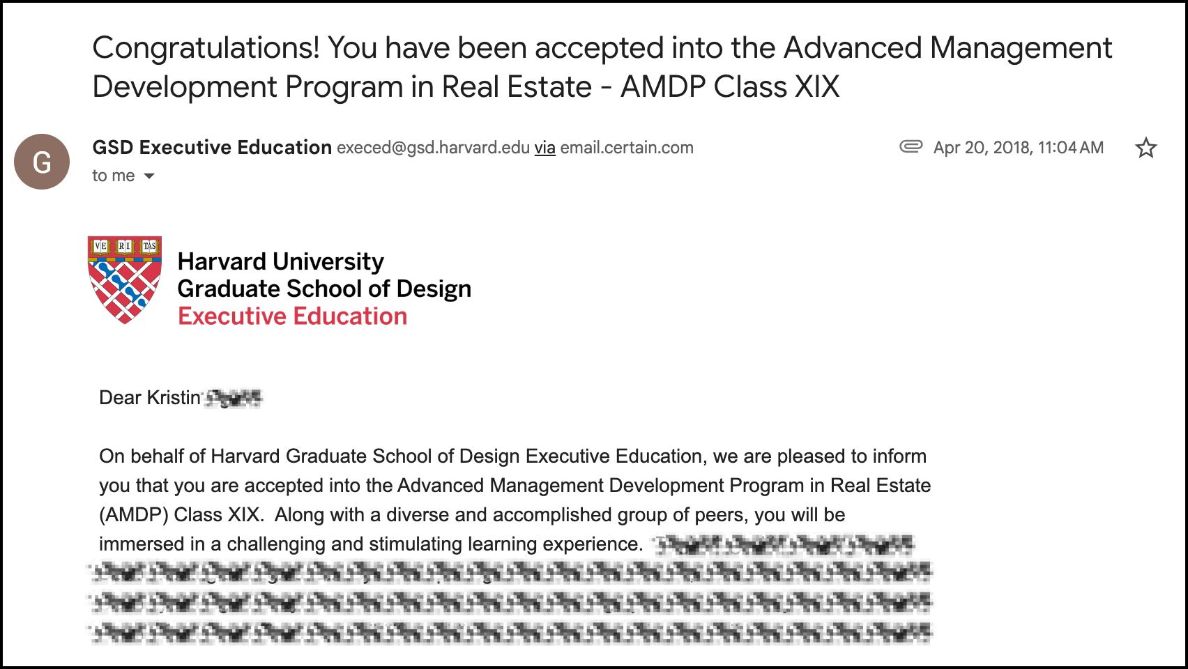 Harvard Business School doesn’t offer an Executive MBA, but Harvard Graduate School of Design offers a comparable Executive Real Estate program. And it looked absolutely perfect.